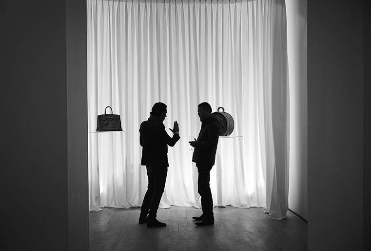 Fascinated by the concept of space and transparency, he first started with the creation of «suitcase-portraits»: suitcases, trunks or handbags built full-scale and in which are stored lucky charms, talismans, of people that inspire him. He chose to sculpt the material carefully and gives birth to precious objects in three dimensions made of different materials (honeycomb cardboard, plexiglass, metal).